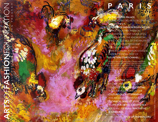 The Arts of Fashion Foundation innovative Paris 4-week intensive Fashion program - known as the Arts of Fashion MasterClass - is taught in English. This Arts of Fashion Summer program is an excellent opportunity and unique frame for excellence to enhance fashion students' creative identity with consistent personal research. We aim to sharpen interest and skills in contemporary fashion draping and artisanal embellishment while advancing fashion design and gaining a deeper understanding of the culture of fashion. Every session, a group of selected international fashion students and recent graduates (no more than 5 years) have the opportunity to learn genuine Haute Couture know-how from the prestigious Maison Lesage, Maison Lemarié and Atelier Lognon - part of Les Métiers d'Art Chanel. Students have to incorporate this knowledge into their own creations under the Art Direction of guest creative designers. Previous Paris MasterClass guests included leading creative designers such as Anthony Vaccarello (2010), Aurore Thibout (2011), Christine Phung and Lucile Puton (2012), Zoe Vermeire (2013), Raphaelle H’Limi and Kenta Matsushige (2014), Long-Nam To (2014/15), Yiyu Chen & Haesung Bong (2015), Stephanie Coudert (2016-17), Gustavo Lins (2018) and Alicia Declerck (2019). ONE FLEW OVER THE MASTER'S NEST Creative Guest Designers - ALICIA DECLERCK & BRANDON WEN For the 2021 edition of the Summer Arts of Fashion Masterclass in Paris, we are inspired by the timeless French poet Jean de La Fontaine, born 400 years ago, and his work "Les Fables de La Fontaine". ALICIA DECLERCK | Belgium BRANDON WEN | United States Photo Portrait Sara Krzyzaniak | Brandon Wen and Alicia Declerck - 2021 Illustration - MARC CHAGALL - 1928 - Les Fables de La Fontaine - Collection Marcel Arland, Paris. Arts of Fashion Foundation MasterClass 2021 - Accepted participants HEEWON CHOI | South Korea– Seoul | Kookmin University The intensive 4-Week fashion program is open exclusively to fashion students registered in a School or University and recent graduates (see process of application) as well as the Arts of Fashion Scholarship Awarded designers 2019 and 2020. THE ARTS OF FASHION FOUNDATION'S 4-WEEK MASTERCLASS - SERIES IS MEANT TO: - Increase, develop and promote creativity by exposing talented students to different cultural environments, design approaches and new techniques, including the diverse, unique and rich culture of craftmanship from the Parisian Haute Couture. This course studio program is taught in English by a team of fashion and textile designers for a class of 15 students maximun. The Arts of Fashion Foundation is offering to fashion students and recent graduates another opportunity to work with rising creative designers and explore the exclusive reservoir of Haute Couture through unique collaborations including prestigious Maison Lesage and Maison Lemarié. The main idea is not only to sharpen participants’ skills, increase their vision and develop their creative potential, but also pushing their design and inventiveness boundaries to the appropriation of the know-how or savoir-faire. - LAB is a studio course dedicated to design and execute finished garments from the original silhouette with prominent designers as critics. Students develop and define their own concept through the themes given and following their design research. The Salon des Boiseries from the Decorative Arts Museum hosts the ephemeral exhibition of the work in progress produced by participants the last Thursday of the session (5-9PM). A photoshoot is also organised the last Wednesday for portfolio purposes. A certificate of participation is delivered to students according to full attendance of the fashion masterclass and work. The Arts of Fashion Foundation certificate of achievement is given only to students who completed all the requirement and which work is exhibited.