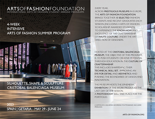 The Cristobal Balenciaga Museum will host the ephemeral exhibition of the work in progress produced by participants the last Thursday of the session (5-9PM). A photoshoot is also organised the last Friday for portfolio purposes. A certificate of participation is delivered to students according to full attendance of the program and work. The Arts of Fashion Foundation certificate of achievement is given only to students who completed all the requirement and which work is exhibited.